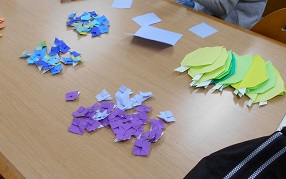 【給食】今日の給食は、チキン味噌カツ・ひじきのあえもの・五目スープです。健康委員会からの給食クイズでは、牛乳200mlとごはん茶碗1杯分のひじきは、同じ量のカルシウムが含まれていると発表がありました。あしっこ達は、育ち盛り!!残さずたくさん食べましょう。給食の片付けも、とても上手にできました。
