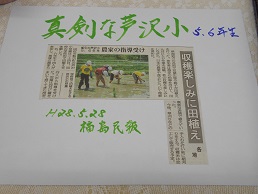 5月24日(火)に行った学校田への田植え作業の様子が、福島民報社様の新聞記事に掲載されました。教育活動が記事に掲載されることによって、子ども達の活動の励みになります。また、芦沢郵便局長様が、その記事を局内に掲示(下部写真)していただいていました。誠に感謝申し上げます。