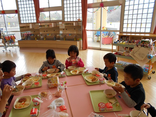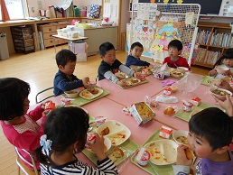 今日の給食は今年度初めてのパンです。芦沢幼稚園のお友だちは、自分の口の大きさに合わせて、パンを小さく分けてから上手に食べることができました。。