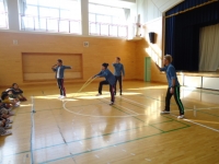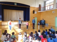 今日、「カプリオール」が来校しました。世界でもトップクラスのダブルダッチパフォーマンスの技は驚きの連続でした。世界でたった一人しかできない難しい技も披露していただき、子どもたちも大喜びでした。また、メンバーの方からは「夢を叶える魔法の言葉は『ありがとう』と『あいさつ』だよ。」と教えていただきました。世界で認められている方々とふれあえた時間は、子どもたちにとって夢のような時間となりました。