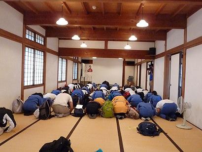 予定通りに宿泊場所「いずみや」に到着。広い玄関ホールで到着式をしました。