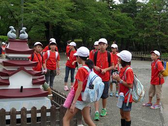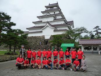 いざ、フィールドワークに出発。はじめは全部の班一緒に鶴ヶ城で記念写真をパチリ。