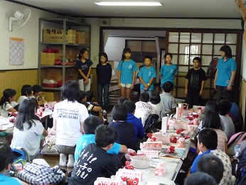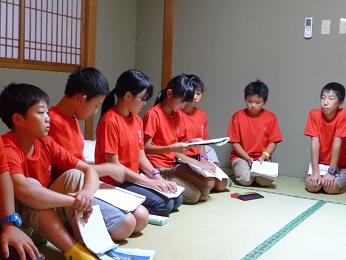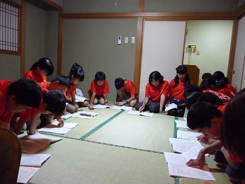 夕食後、今日は全員で反省会。今日の感動を綴った作文を一人一人発表しました。