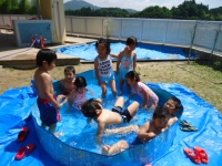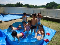 今日は天気も良く、気温もぐんぐん上がりました。そこで幼稚園では特設プールを用意!子どもたちは歓声を上げながら思いっきり水遊びを楽しんでいました。