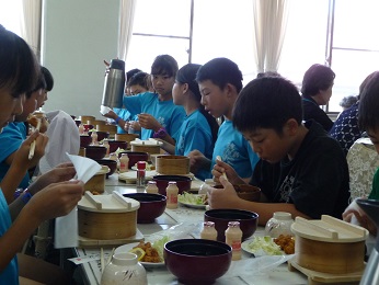 宿泊学習最後の食事は、鶴ヶ城のそばで「わっぱ飯」でした。