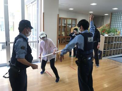 今日は田村警察署の方々3人にお越しいただき、防犯教室が行われました。訓練前には、教職員がさすまたの効果的な使い方をご指導いただきました。