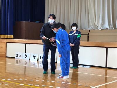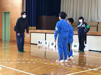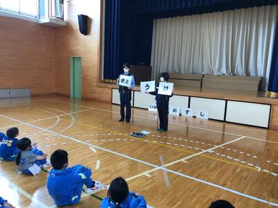 訓練後の全体会では、不審者対応の原則「いかのおすし」のお話や、さらに、「きょうは」も付け加え、「きょ」は、「距離を取る」「う」は、「後ろにも気を付ける」「は」は、「早く帰る」ことの大切さも教えていただきました。高学年の児童が実際にいい例と悪い例を上手に演じ、どのような行動が自分の命を守るのかをしっかり理解することができました。