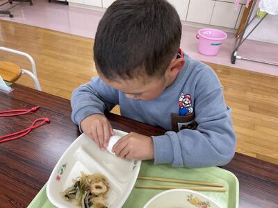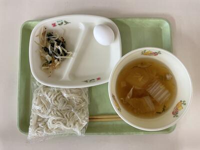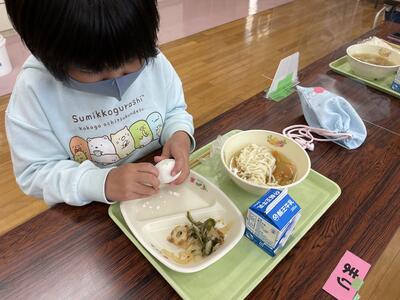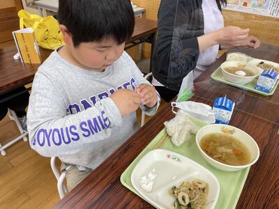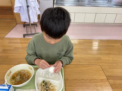 今日の給食のメニューは、おかかあえ、ぶたすきうどんじる ソルトエッグでした。ソルトエッグは殻付きで、「いただきます!」のあいさつの後、みんな静かに卵をむきはじめました。卵の殻を初めて剥いた子もいたようですが、みんなおいしくいただいていました!ごちそうさまでした!