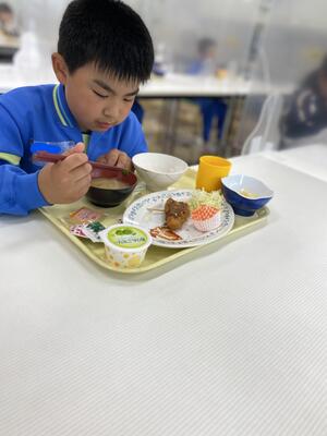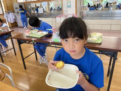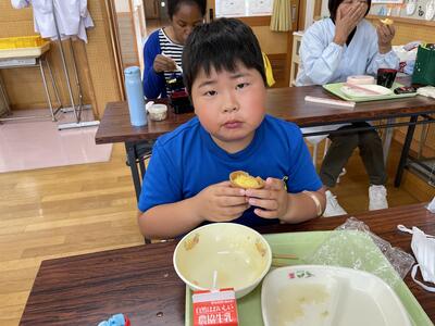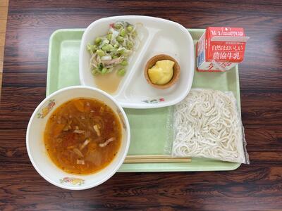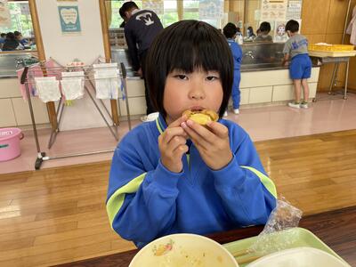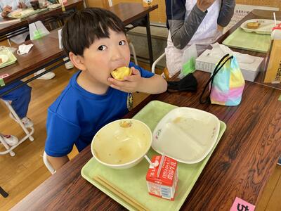 今日の給食はトマトスープスパゲッティ えだまめサラダ てづくりパイナップルタルトでした。今年度初めてのメニューで、1年生も大喜び!ランチルームから教室に帰ってきても「今日のデザートおいしかった!」「今度また出ないかな」とうれしそうに話していました。