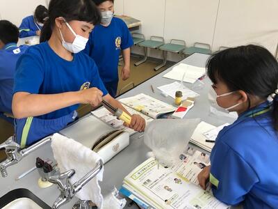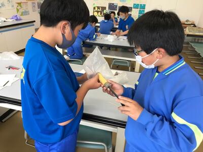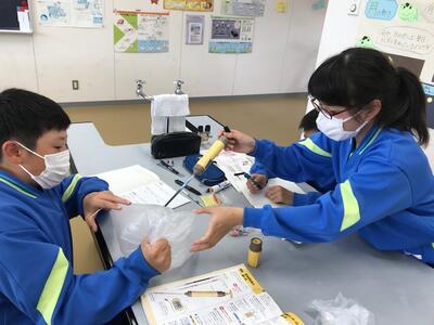 石灰水や気体検知管を用い、周りの空気と吐き出した空気の酸素や二酸化炭素濃度を調べました。すっかり気体検知管の操作にも慣れ、人は酸素の一部を取り入れ、二酸化炭素を吐き出していることを理解することができました。
