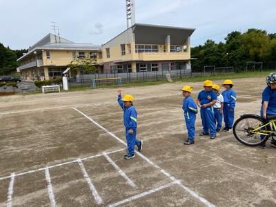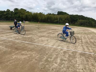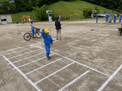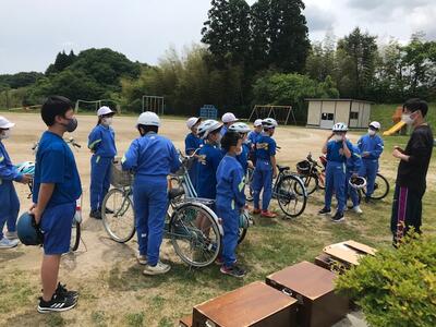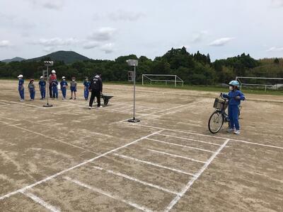今日は学年ごとに交通安全教室を行いました。教室では、低学年で信号機のある横断歩道の正しいわたり方など、中・高学年では自転車の正しい乗り方などを学習し、その後、校庭で実際に歩いたり、自転車に乗ったりしました。