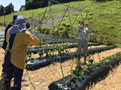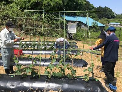 2022年6月2日 13時55分今日は、4名の学校支援ボランティアの方にお越しいただき、芦沢ファームの棚を作っていただきました。昨年の収穫祭の焼き芋作りでもお手伝いいただいた皆さんなので、息もぴったりで、次々にミニトマトときゅうりのための棚を作ってくださいました。また、野菜作りのコツも伝授していただきました。子ども達にも伝え、ますます畑作業に興味をもって関われるようにしたいと思います。暑い中、本当にありがとうございました!