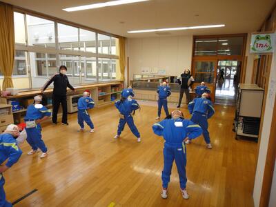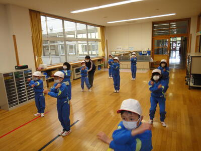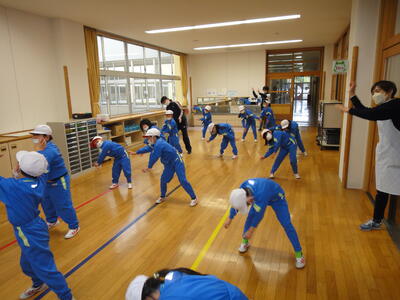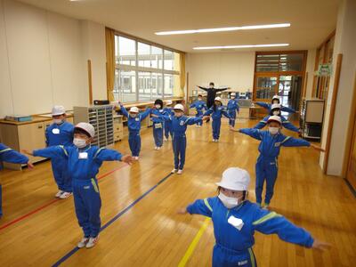 来月のあしっこ大運動会に向けて、4月のマラソンタイムの時間は、各フロアでラジオ体操をしています。1年生は初めてのラジオ体操です。今日は2年生と一緒に練習をしました。2年生の動きがとても上手で、良いお手本になっていました。5月の運動会まで、練習をがんばって覚えましょう!