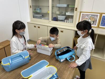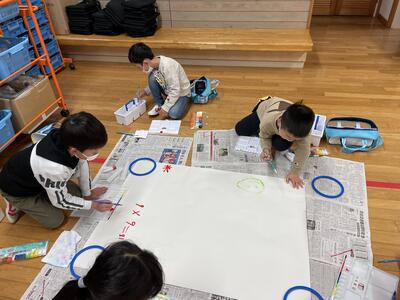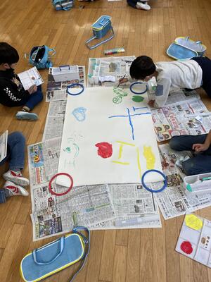 今日の4時間目に1年生は初めて絵の具セットを初めて使いました。2年生がパレットや筆の持ち方、バケツに入れる水の量などについて教えてくれました。その後、班ごとに分かれて大きな模造紙に絵をかきました。1年生は「水色かきたいけどどうすればいいの?」と聞くと2年生が「青と白を混ぜればいいんだよ」と優しく教えてくれました。これからどんどん素敵な作品が生まれそうです!