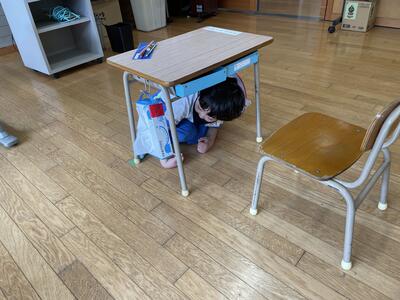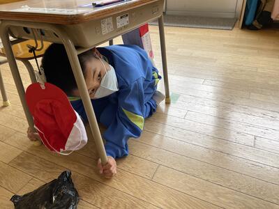 今回は予告ありで、大きな地震が発生し、家庭科室からの出火による避難です。放送がなると同時に全校生が動きを止め、指示に従い、机の下で頭を守り、その後校庭に避難しました。