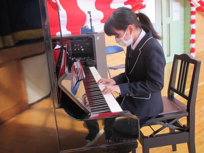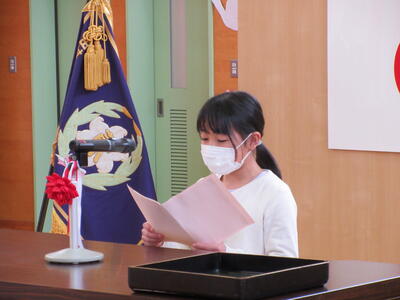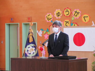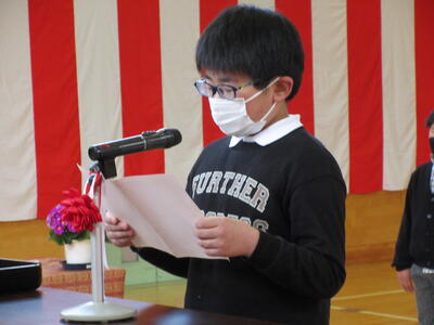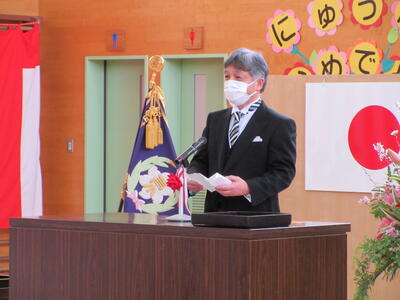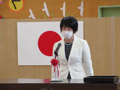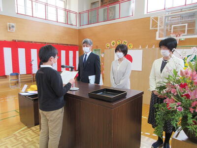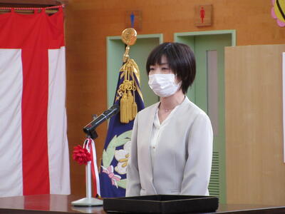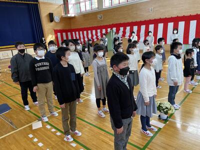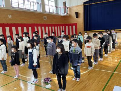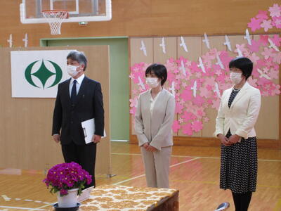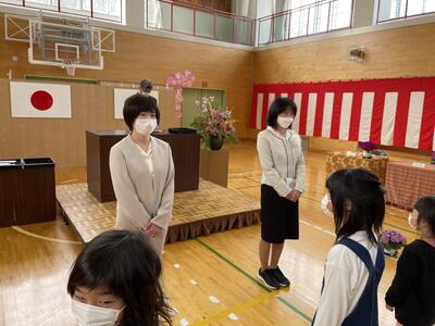 転入された先生の着任式を行いました。着任式では、転入された校長先生と2人の先生からあいさつをいただき、その後、6年生の代表の児童が歓迎の言葉を述べました。
