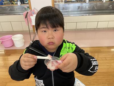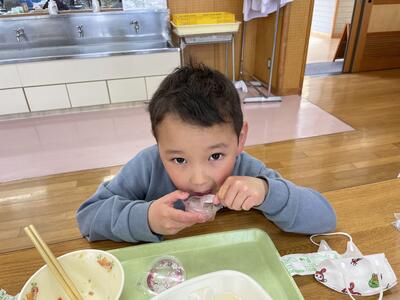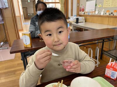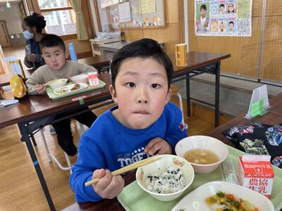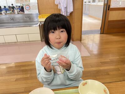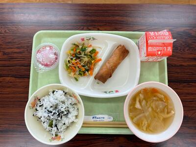 今日は今年度最初で、1年生にとっては初めての給食でした。メニューは わかめごはん、春キャベツのみそしる、菜の花あえ、春巻き、桜ゼリーでした。1年生はランチルームに向かう時から楽しみで手指消毒をしながらも「なんかいい匂いがしてきたー!」と待ちきれない様子でした。