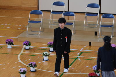 卒業生は立派な態度で卒業証書授与を行っていました。授与の後には一人一人が今まで育ててくださった感謝の思いをこめて、おうちの方に花束を渡しました。
