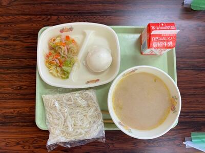 今日の給食は、長崎ちゃんぽん、ミニ肉まん、中華和え、牛乳です。長崎ちゃんぽんは、肉や野菜、魚介がたくさん入った白いスープの麺です。ミニ肉まんも、真っ白い皮に包まれていて、中身は食べるまでのお楽しみ、でした。今日もおいしくいただきました!