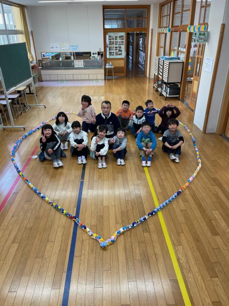 来週1・2年生が一緒にお楽しみ会をします。1年生は教室装飾用の輪飾りをたくさん作りました。そこで、輪飾りで大きなハートの形を作り、急遽校長先生と1・2年生のみんなで撮影会になりました。素敵な思い出の写真ができました!