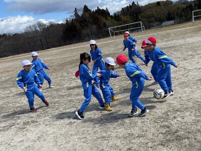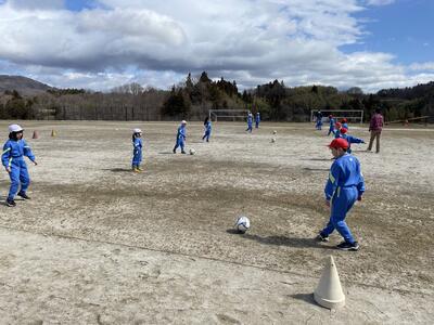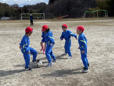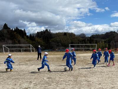 だいぶ温かくなってきたので、1・2年生の今日の体育は、校庭でサッカーをしました。久しぶりの土の感触を楽しむことができました。