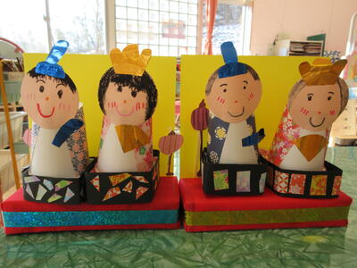 幼稚園では、園児がそれぞれ個性あるひな人形を作成しました。
