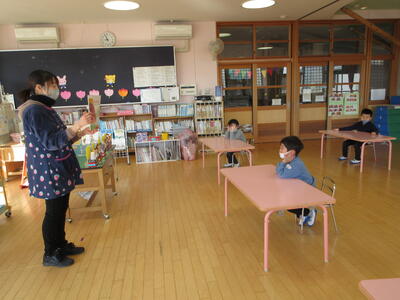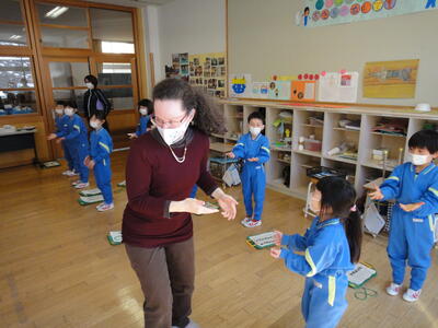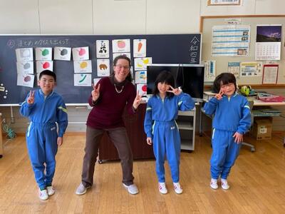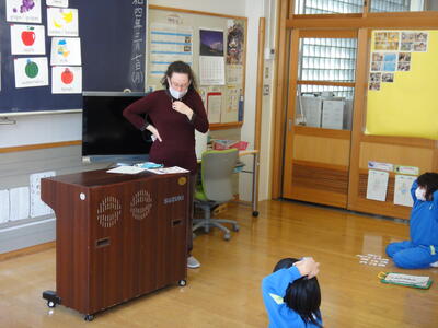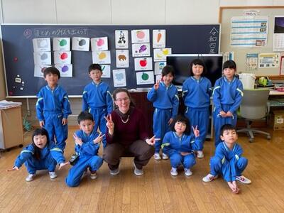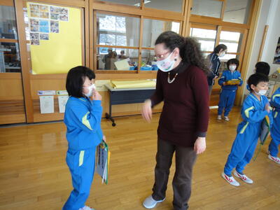 2022年3月7日 16時05分今日の2時間目は、1・2年生にとって今年度最後の外国語活動の日でした。1年間ヒラリー先生と一緒に学習したことをもとに、一人一人がクイズを出しました。2人ペアになり、一人がヒントを2つ言います。ヒント1は英語で「色」を言いいます。次にヒント2で「野菜」や「果物」「動物」などを言いました。1年間の学習で、積極的に、豊かな表情で英語を話せるようになり、クイズ大会も大いに盛り上がりました。