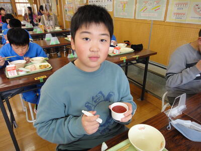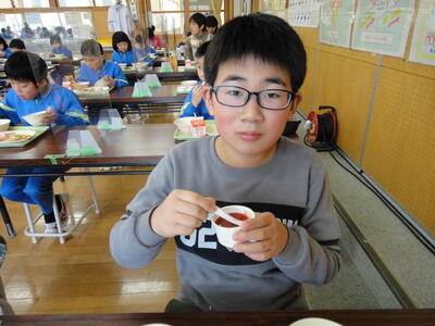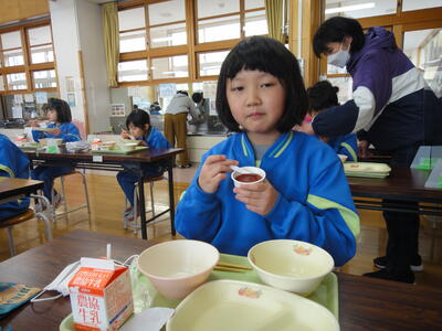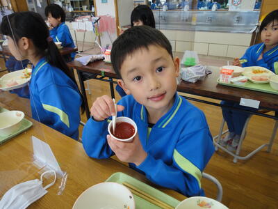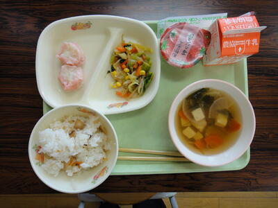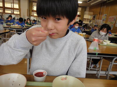 今日は3月3日、桃の節句です。給食の献立は 桜シューマイ 菜の花あえ すまし汁 ちらしずし イチゴゼリーでした。桜シューマイはほんのりピンク色で、デザートのイチゴゼリーは情熱的な赤い色をしていました。みんなおいしくいただきました!