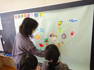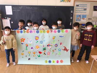 1年生が図画工作科「こころのはなをさかせよう」に取り組みました。出来上がったものは、6年生へのプレゼントにして渡しました。とてもカラフルで、素敵なお花畑ができあがりました。感謝の気持ちも込められた生き生きとした作品になりました!