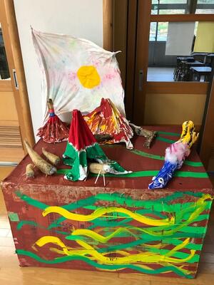 3・4年生はあいにくの雨の中、田村消防署に社会科見学です。教室前には図工の時間に取り組んだヘチマを使った作品が展示されています。