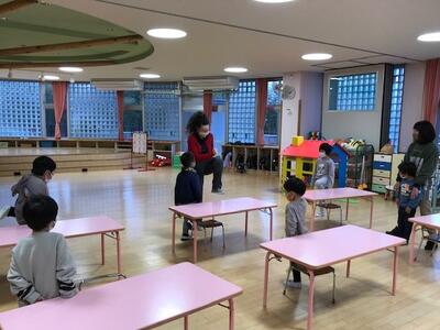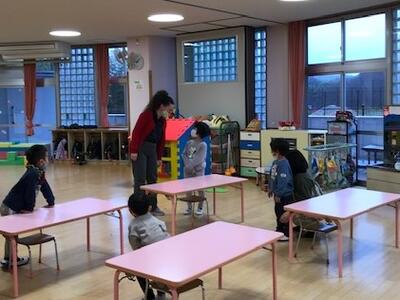 今日はヒラリー先生との英会話の時間です。数字の学習で、いろいろな動きをし、英語で回数を数えていました。大きな声で数えることができました。