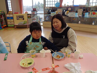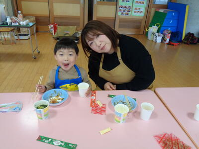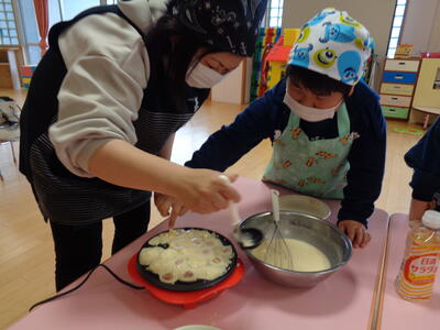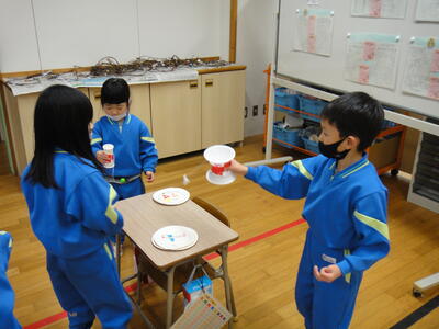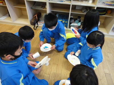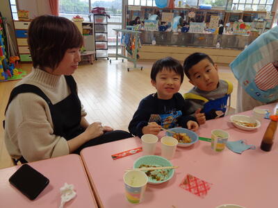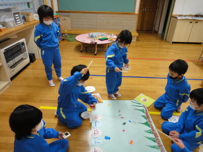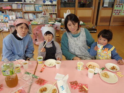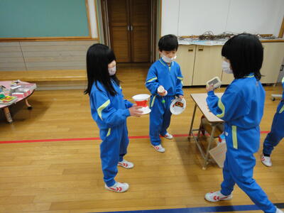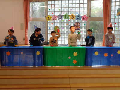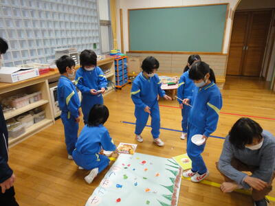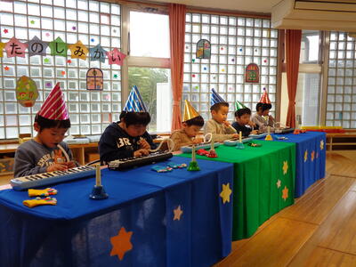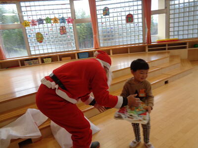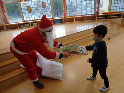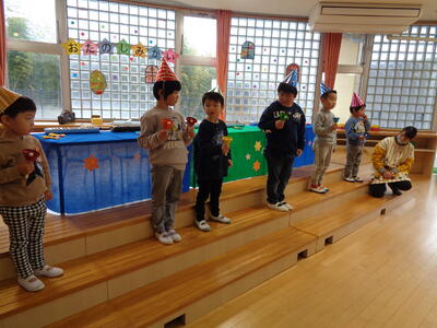 金曜日に園児たちが楽しみにしていた「おたのしみかい」がありました。おうちの人に楽しんでいただけるよう練習してきました。ハンドベルで「きらきら星」、鍵盤ハーモニカで「メリーさんのひつじ」を演奏し、「さんぽ」を歌い、「あわてんぼうのサンタクロース」にあわせフィンガータップを行うなど盛りだくさんでした。とても立派な発表でした。サンタさんも登場し、みんな素敵なプレゼントをもらっていました。親子でたこ焼きやパフェを作ったりと楽しい時間を過ごしました。