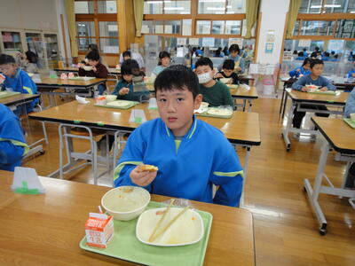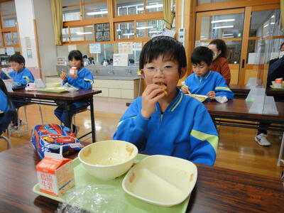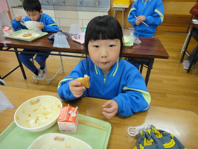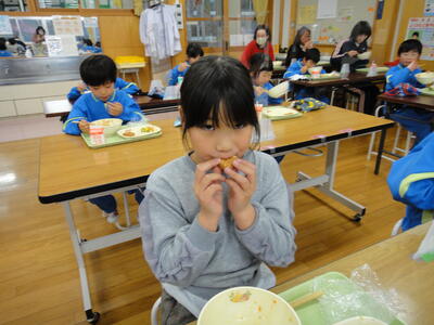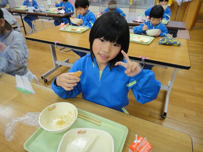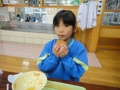今日の給食に、かわいらしいたい焼きが出ました。「中身なんだろう?」「あんこじゃないの?」と配膳の時から興味津々!中身はきれいな色をしたカスタードクリームでした。