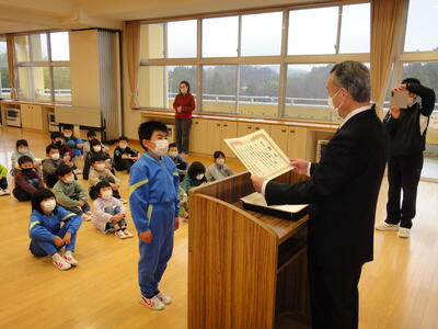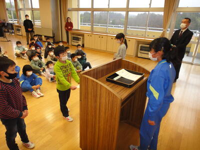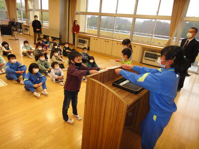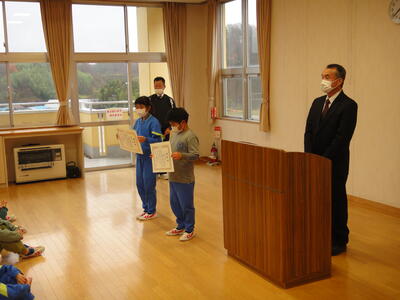 今回の全校集会では、県児童作文コンクールや阿武隈川上流児童図画コンクールでの表彰がありました。また情報委員会の委員長さんから完読賞の表彰もありました。