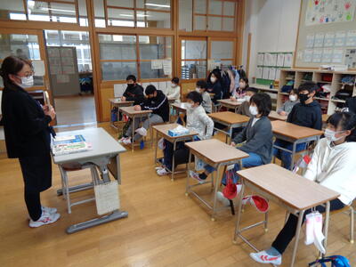2021年12月13日 15時40分5・6年生が、図書支援スタッフの吉田先生におおすすめの本を紹介していただきました。今回のテーマは「クリスマス」と「お正月」に関する本です。クリスマスの幽霊のお話「クリスマスキャロル」やお正月の食べ物に関する言葉の本など、5冊の本を紹介いただきました。季節に合ったおもしろそうな本の紹介に、子どもたちは興味津々でした。