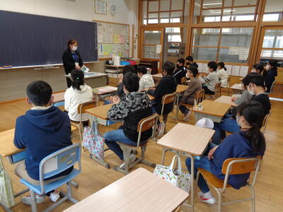 5・6年生が、図書支援スタッフの吉田先生におおすすめの本を紹介していただきました。今回のテーマは「クリスマス」と「お正月」に関する本です。クリスマスの幽霊のお話「クリスマスキャロル」やお正月の食べ物に関する言葉の本など、5冊の本を紹介いただきました。季節に合ったおもしろそうな本の紹介に、子どもたちは興味津々でした。