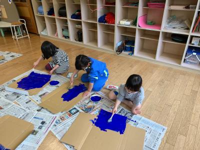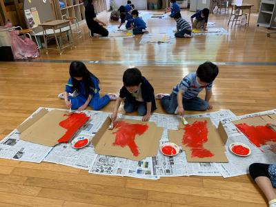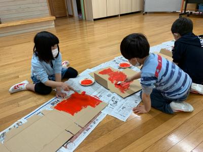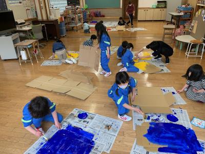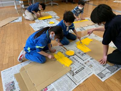 今日の1・2年生の図工では、運動会で使う小道具作りをしました。一人一人渡された段ボールに、赤・黄・青の3色を濃く、しっかりと塗りました。2週間後の運動会では、今日の小道具作りに負けないぐらいがんばります!