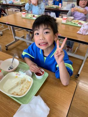 今日は今年度初の給食です。ということで、1年生が初めて給食当番をしました。スプーンを配ったり牛乳をお盆の上に乗せたり配膳をしたりと、みんな協力して上手に出来ました。その後の給食は、とってもおいしくいただきました。ごちそうさまでした!