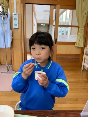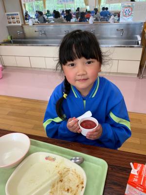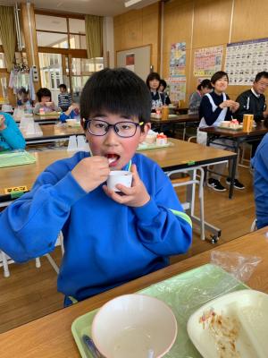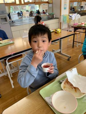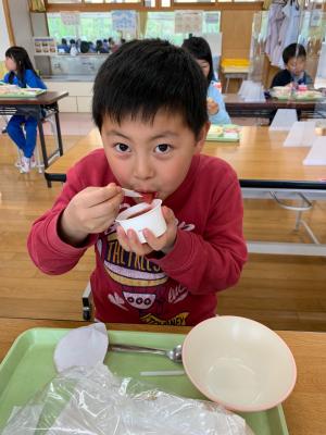 今日の給食は入学・進級お祝い献立でした。黒糖パン、オニオンスープ・サラダとミートボールの他に、イチゴのジュレのデザートがついていました。1年生もとても楽しみにしていて、シャリシャリとした食感を楽しんでいました。