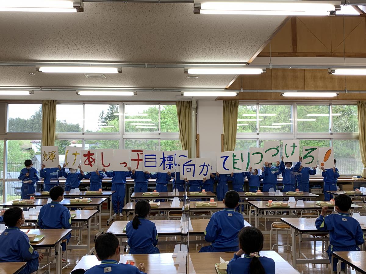 今日の給食の時間に、5・6年生が今年の運動会のスローガンを発表してくれました。