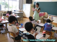 8月31日(水)に、歯科衛生士さんからむし歯にならないためにはどうするか、歯の形や役割はどんなものがあるか、歯みがきの仕方など歯についてたくさんのことを教えてもらいました。
