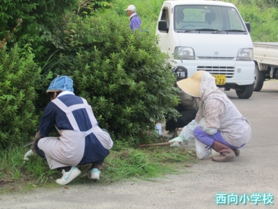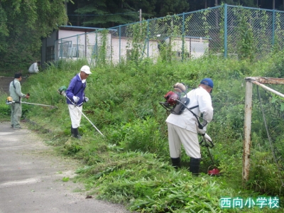 今回は、板橋下と西美田の両地区の皆さんが、校庭周辺の草刈りをしてくださいました。