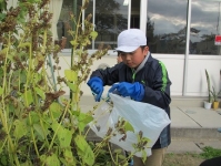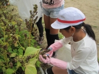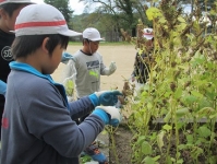 子どもたちは、エゴマを落とさないように気を付けながら実のついている部分を摘み取りました。摘み取ると、エゴマのいい香りが辺りに漂ってきました。