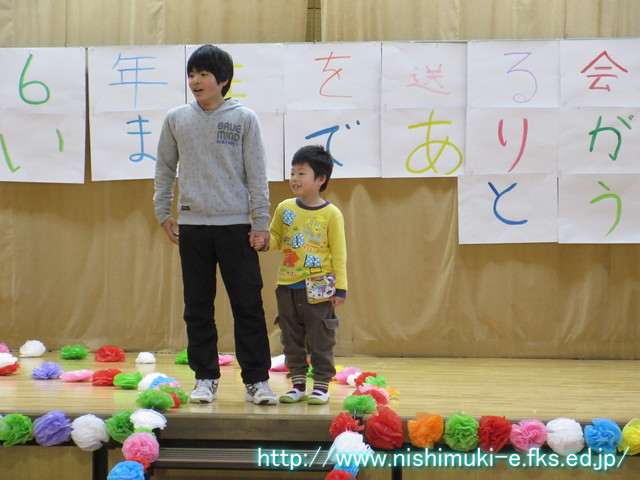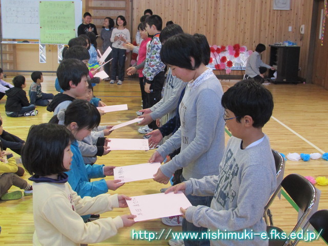 はじめに1年生に誘導されながら、恥ずかしそうに入場した6年生。お世話になった在校生が6年生一人一人を紹介しました。6年生の学校での様子がよくわかる内容でした。