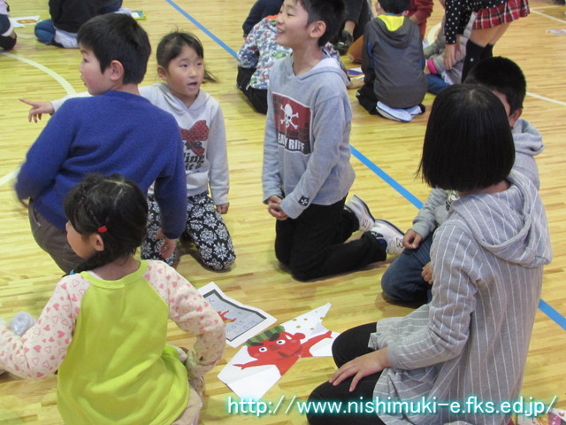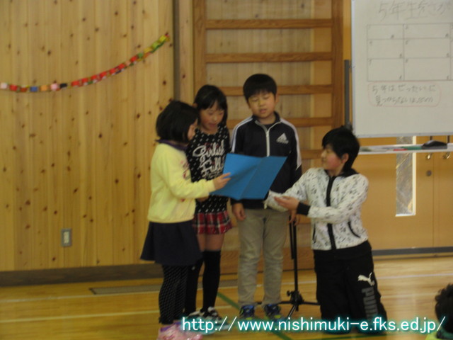 実行委員長の佐久間君は「卒業間際の6年生と楽しい思い出のひとときを一緒に過ごしましょう」と、あいさつをしました。はじめに「5年生を探せゲーム」、次に「パズルゲーム」を、仲良しグループ(縦割りグループ)で行いました。最後に在校生が書いた色紙をプレゼントして終わりました。