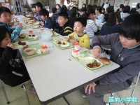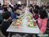 本校は,全校生が食堂で学年ごとのテーブルで給食を食べますが,今日は,なかよしグループごとにまとまって楽しく給食を食べました。6年生の班長・副班長さんを囲んで楽しく食事をすることができました。