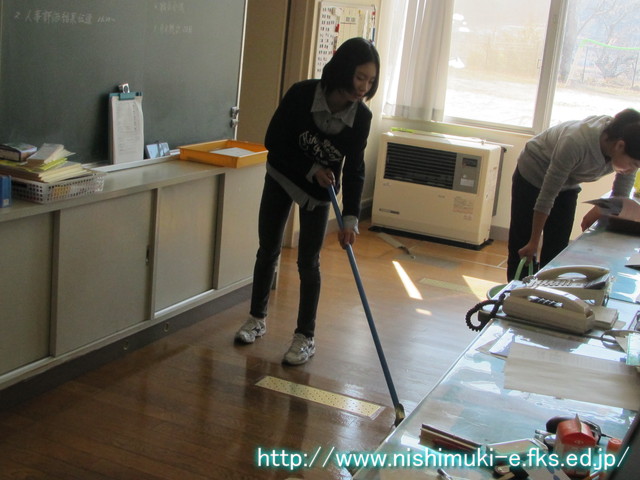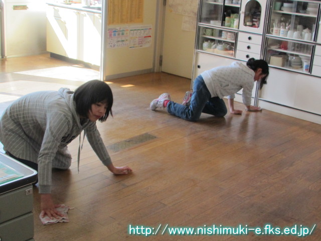 清掃の時間に、教室の荷物を全部廊下に出しました。その後全員で、教室や特別室、食堂などの水拭 きをし、床の汚れを落としました。その後、5~6年生が中心となってワックスをかけました。