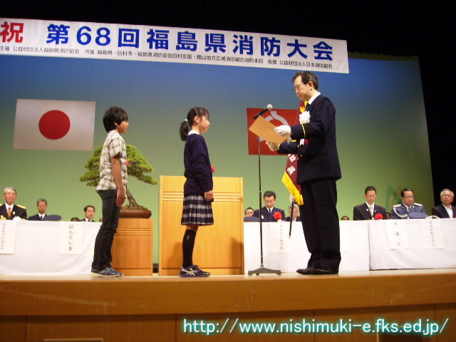 先日、福島県消防大会が田村市文化センターで行われ、西向地区少年消防クラブが県知事賞を受賞しました。