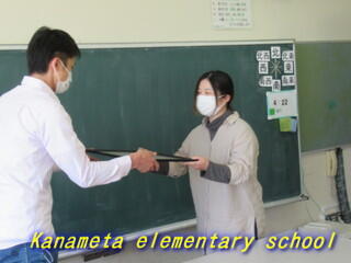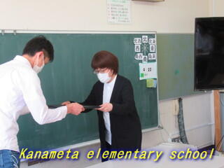 最初に,6年生の代表児童に「交通安全推進員委嘱状」の交付をしました。
