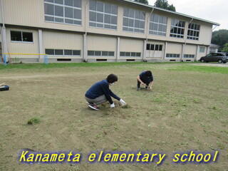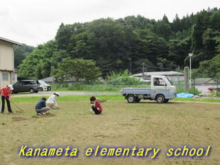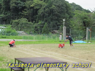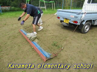 明日の学校再開に向けて、職員で校庭を整備しました。